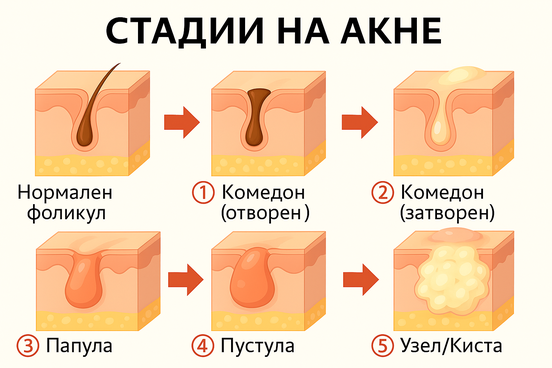 Това, което се появява на кожата – пъпки, черни точки или кисти – е само последният етап от един дълъг процес. Истинският проблем започва дълбоко под повърхността, когато излишният себум, запушените пори и бактериите предизвикват възпаление.