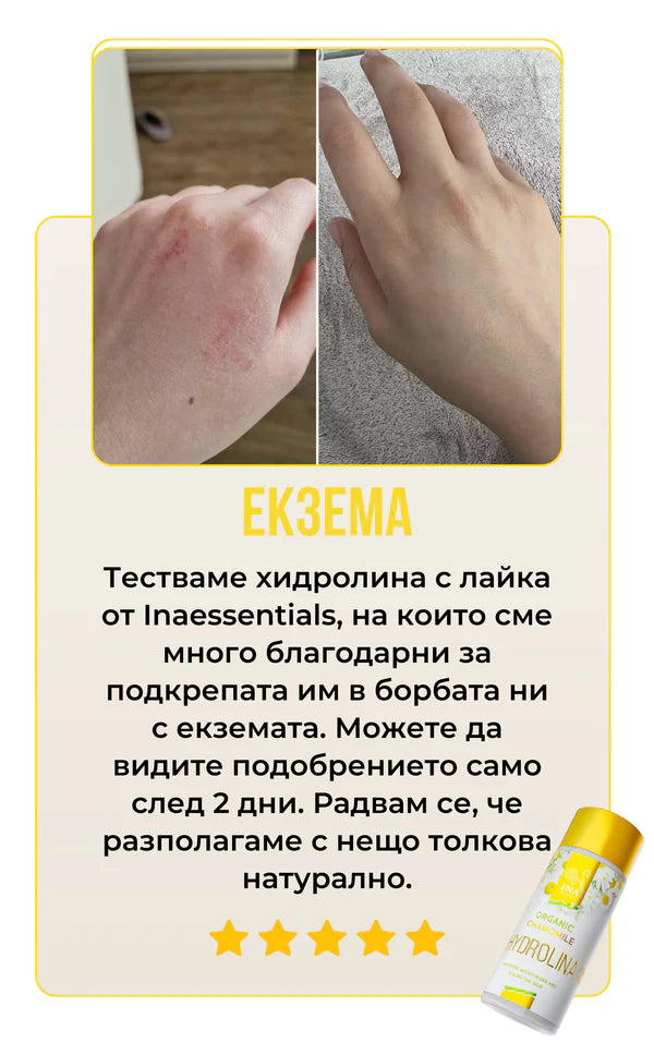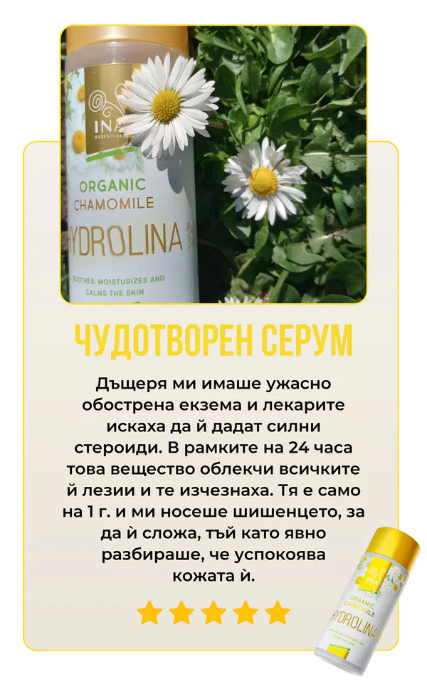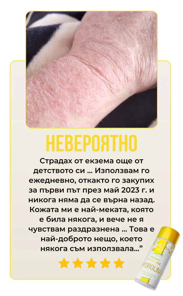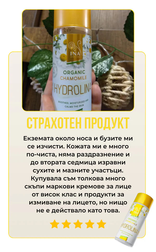 Био Вода от Лайка - Hydrolina (150мл.) не е просто красива бутилка - отзивите от реални клиенти доказват нейната ефективност. С впечатляващ резултат от над 90% удовлетвореност на потребителите, Hydrolina от Лайка успешно успокоява кожните състояния, като същевременно подобрява здравето на кожата. Не вярвайте само на думите ни, а прочетете истинските истории на нашите клиенти.