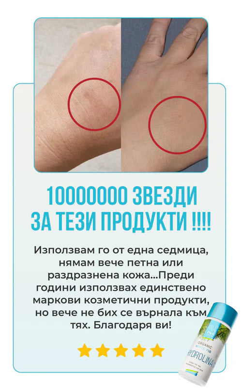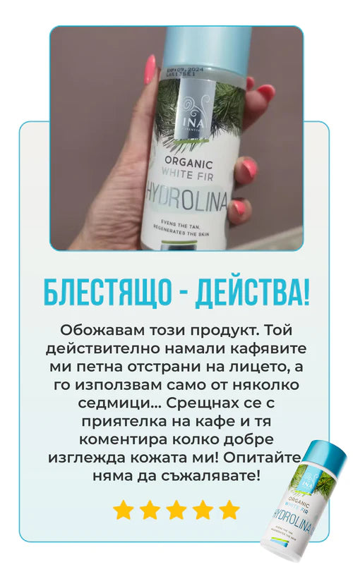 Био Вода от Бяла ела - Hydrolina (150мл.) не е просто красива бутилка - отзивите от реални клиенти доказват нейната ефективност. С впечатляващ резултат от над 90% удовлетвореност на потребителите, нашият продукт активно регенерира кожата, намалява пигментацията, дребните белези и петната от остаряване, като същевременно подобрява цялостното здраве на кожата. Не вярвайте само на думите ни, а прочетете истинските истории на нашите клиенти.
