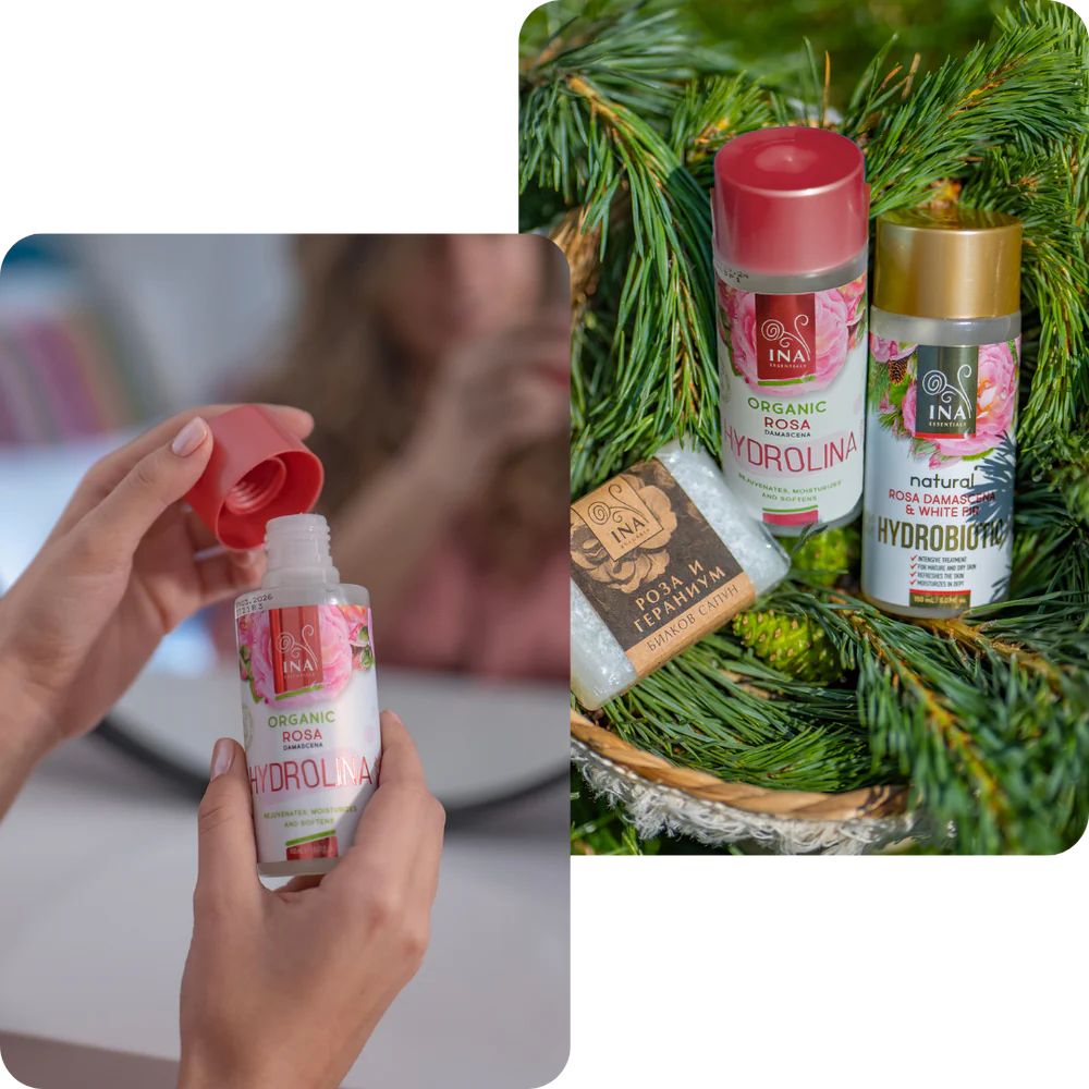 - Стъпка 2: След това нанесете нашата 100% Био Розова Вода - Hydrolina за Суха кожа. Антиоксидантните и противовъзпалителни свойства на Розовата вода възстановяват кожата, намаляват фините линии, хидратират в дълбочина и създават защитен щит срещу замърсяванията през деня, осигурявайки перфектната среда за доброто състояние на кожата.