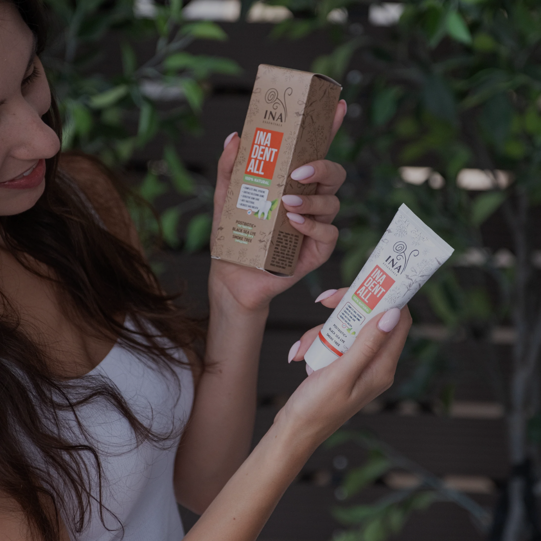 Ina Dent-All е обогатена с мощна комбинация от натурални съставки, включително екстракт от Дива смрадлика, Поморийска луга и постбиотици от Мента и Смрадлика.