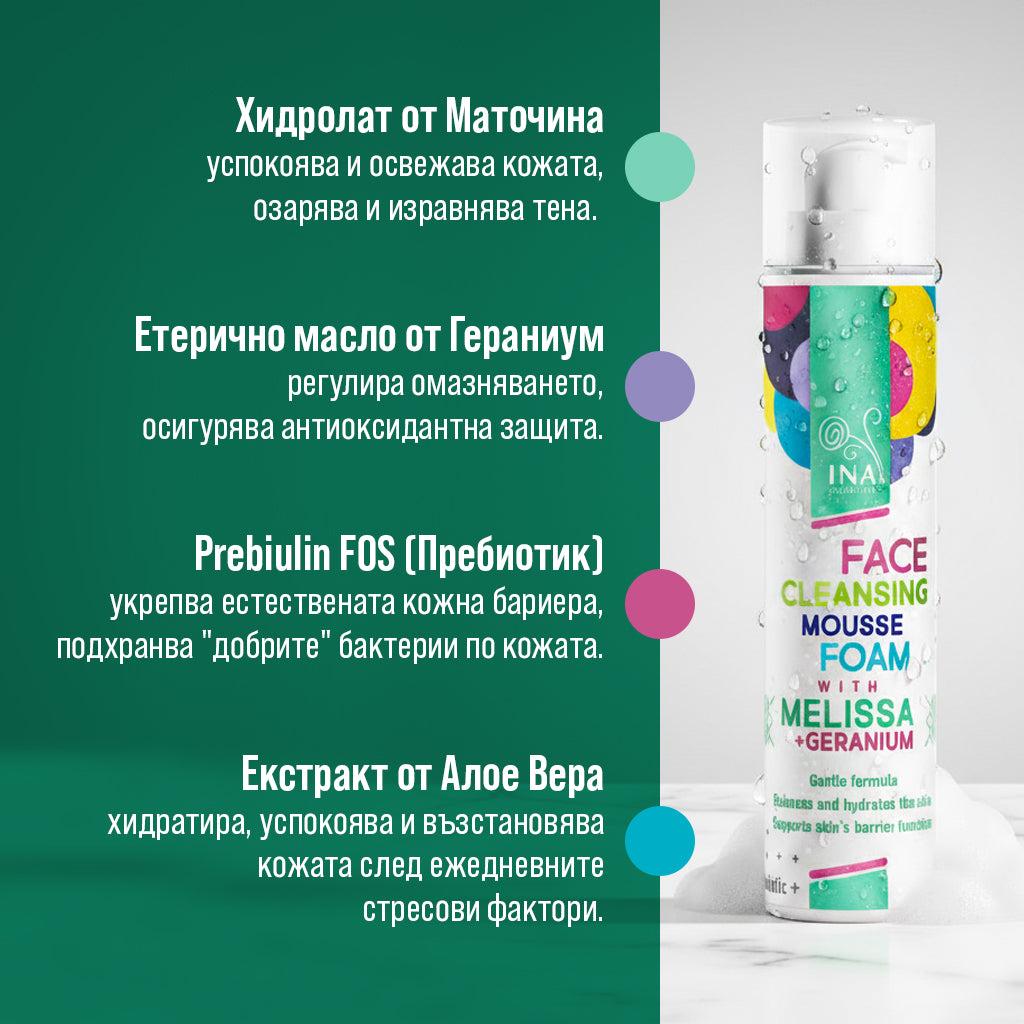 Нежна и ефективна ежедневна почистваща пяна за лице с етерично масло от маточина, гераниум, пребиотик и екстракт от алое. Почиства в дълбочина, без да пресушава. Запазва естествения баланс на кожата. Подходяща за всички типове кожа, включително чувствителна и акнеична.